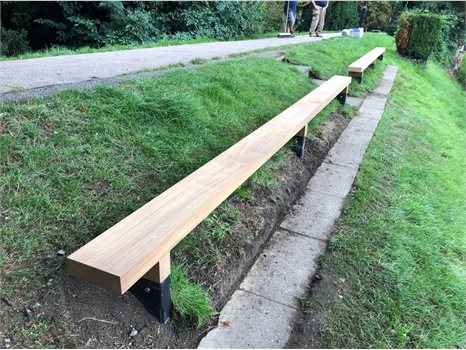 There were originally believed to be four benches on the banks of the Mill Wall, accessed by two sets of concrete steps. Local contractor, Hipperson, undertook the works, recreating the original design and using FSC certified Iroko hardwood.