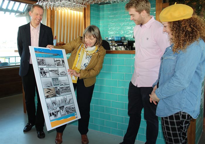 (Cllr Sue Chandler presented owners, Rebecca Hodson and Tim Biggs, with a memento of the history of Deal Pier)
