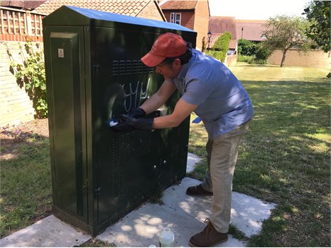 Cllr Holloway cleaning graffiti in Sandwich